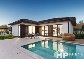 Moderní bungalov HP104L ve tvaru L o celkové užitné vnitřní ploše 103,87m2 a dispozici 4+kk je vhodný pro pozemky o šířce od 18,3 m.