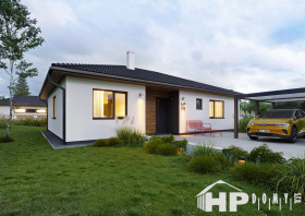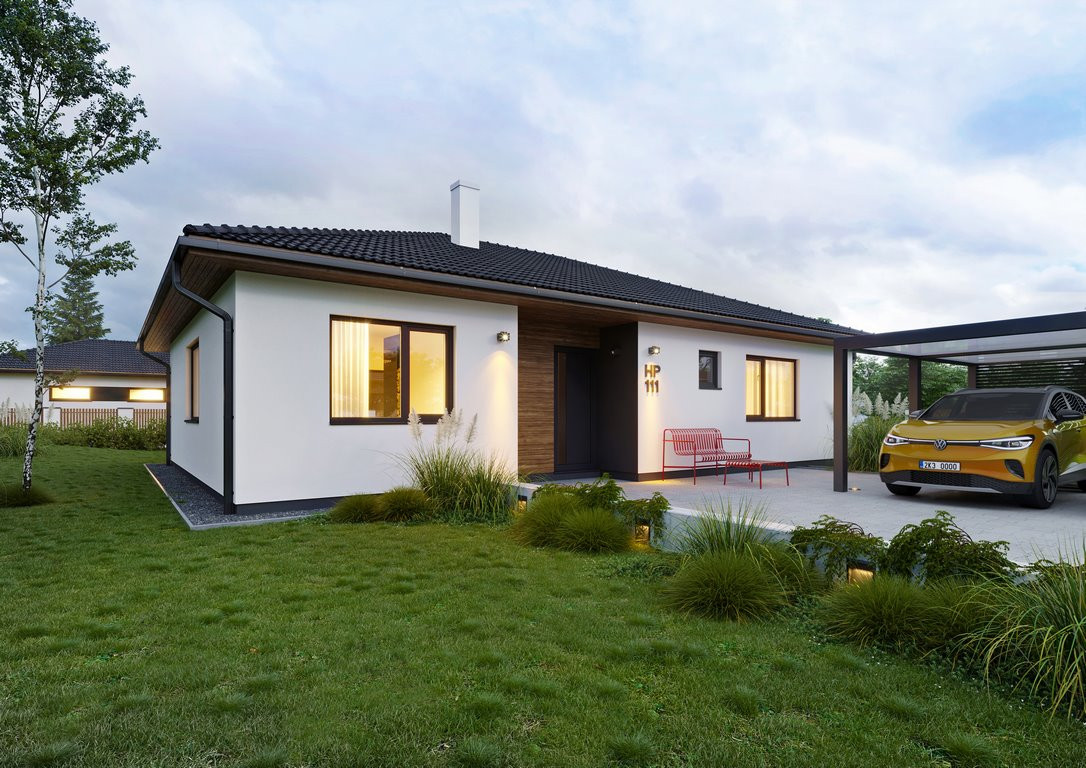 Moderní bungalov HP111 o celkové vnitřní užitné ploše 110,38m2 s dispozicí 4+kk. Je vhodný pro středně široké pozemky o šířce od 19,5 m.