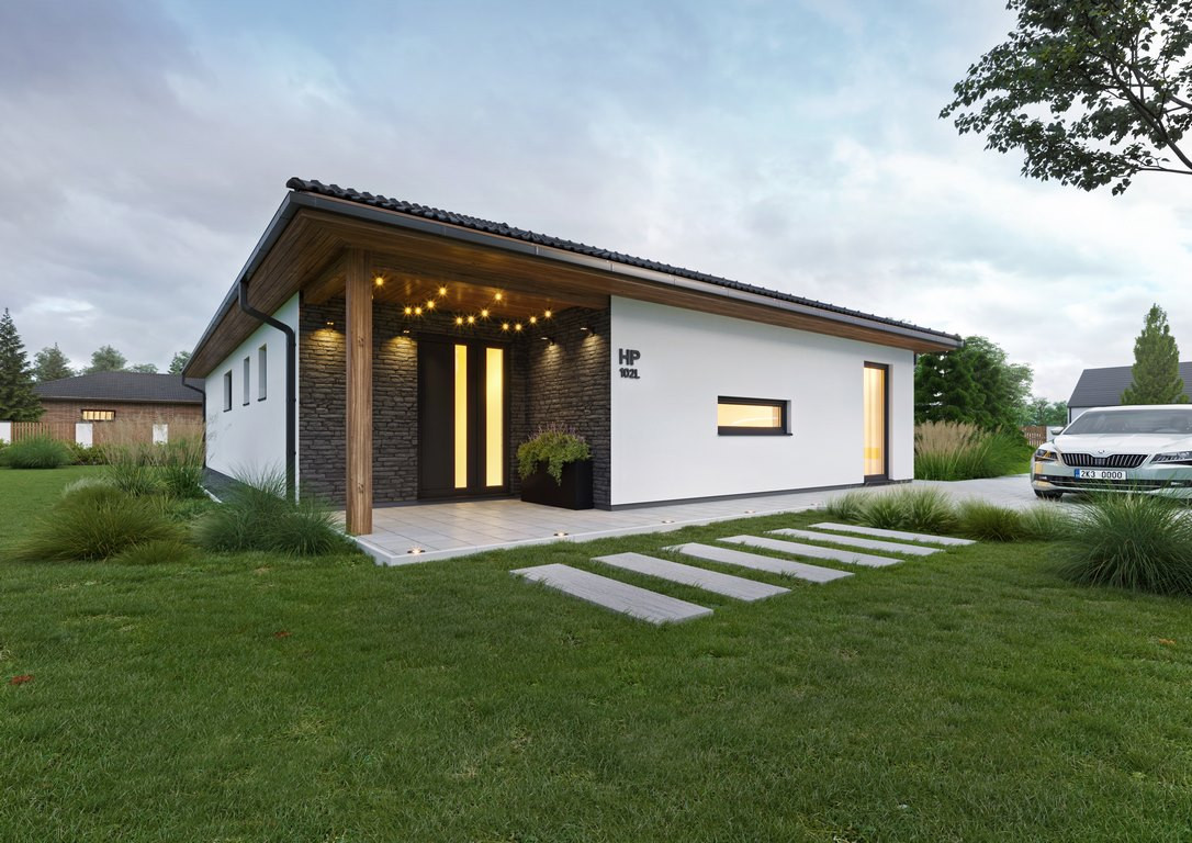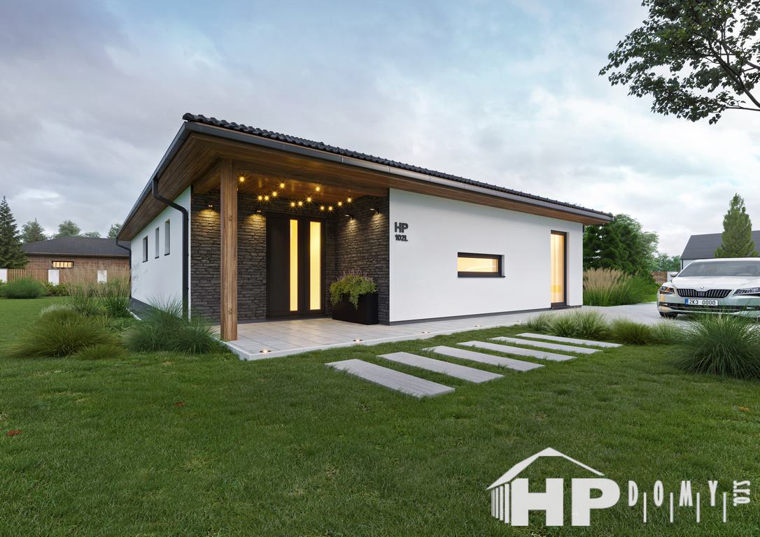 Moderní bungalov HP102L o dispozici 4+kk a užitné vnitřní ploše 102,88 m2, vhodný pro pozemky o šířce od 15,3 m.
